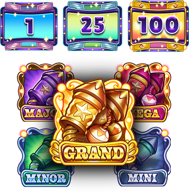 Jackpots available: Mini (x10), Minor (x100), Major (x500), Mega (x1000), Grand (x10,000).